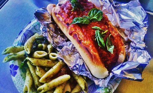 Organic grass fed beef, marinara, melted mozzarella & parmesan cheese, toasted golden on a baguette w/ side pasta salad or kettle chips
